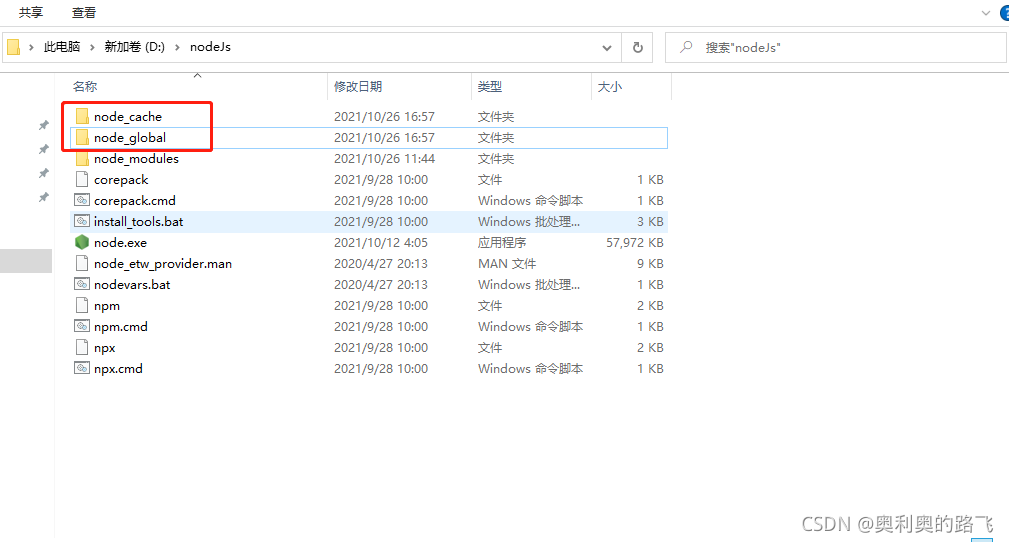 例如:我希望将全模块所在路径和缓存路径放在我node.js安装的文件夹中,则在我安装的文件夹【D:\Develop\nodejs】下创建两个文件夹【node_global】及【node_cache】如下图: