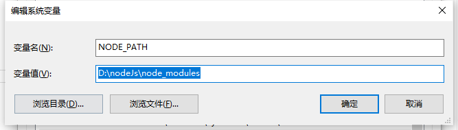 在系统变量中新建: 变量名:NODE_PATH 变量值:D:\nodeJs\node_modules