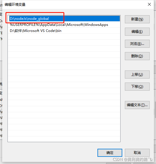然后再用户变量path下点击编辑,在点击新建 D:\nodeJs\node_global并且放到最上方 然后点击确定就配置完成了。